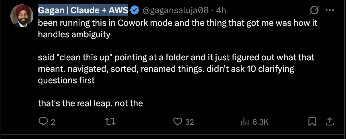 值得注意的是,一些具备一线经验的从业者给出了更细致的观察。一位前 Google 员工表示,自己在使用 Claude 协作模式时,最惊讶的并不是执行能力,而是其对模糊指令的理解能力。“我只是让它‘整理一下这个文件夹’,它就自动去浏览、分类、重命名文件,没有反复确认细节。”在他看来,这种能力的关键不在自动化本身,而在于 AI 已经开始理解“人类真实意图”,而不是逐条执行显式指令。