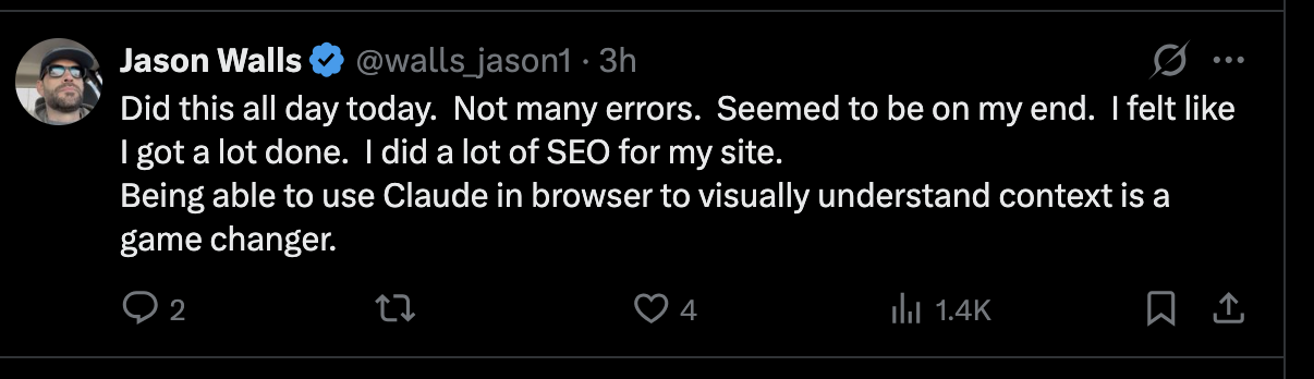 “今天一整天都在用它。没出多少错,反而感觉问题更多出在自己这边。感觉完成了不少工作。我为我的网站做了很多 SEO 优化。能够在浏览器中使用 Claude 来直观地理解上下文,这彻底改变了游戏规则。“
