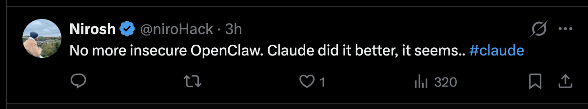有用户直言,相比此前依赖复杂配置与开源生态的 Agent 方案,Claude 这种由大厂主导、强调安全与产品化的路径,更像“正规军”。甚至有人直接表示,不再倾向使用如 OpenClaw 这类相对开放但复杂的系统,而是更愿意选择 Claude 这样“即开即用”的方案。这种评价背后,实际上反映的是用户对稳定性、易用性与安全性的重新排序。