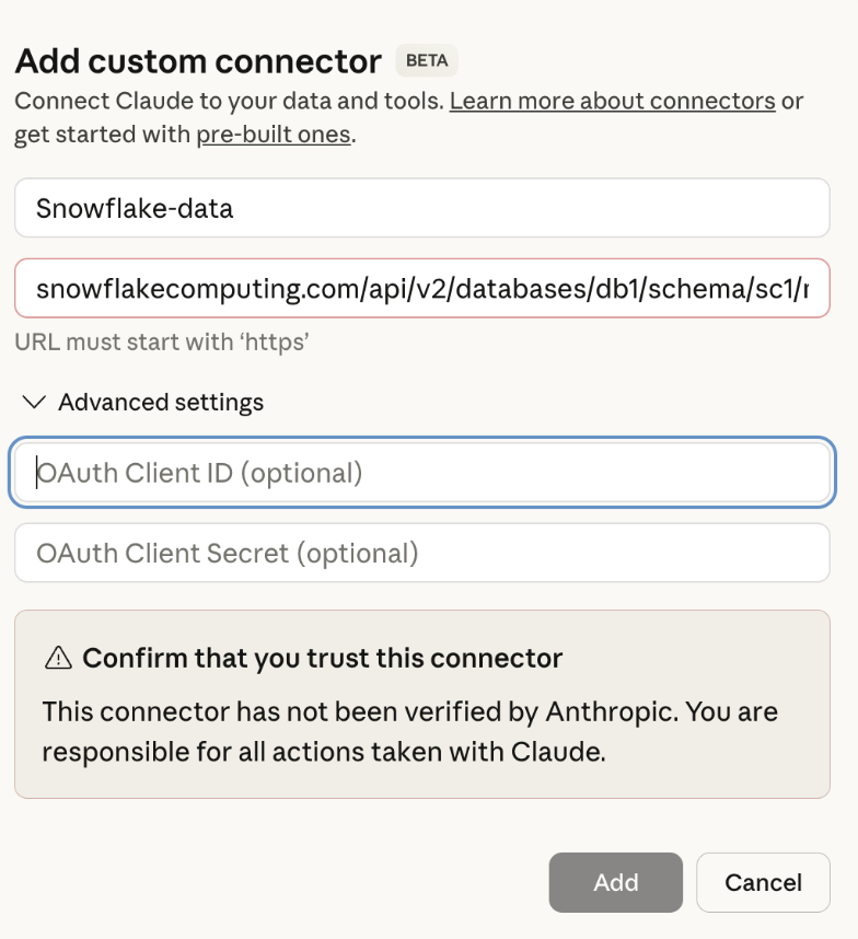 若要在 Claude.ai 中添加 Snowflake MCP 服务器,请点击"添加自定义连接器"并导航至组织连接器界面。随后将 Snowflake MCP 服务器作为自定义连接器进行配置。