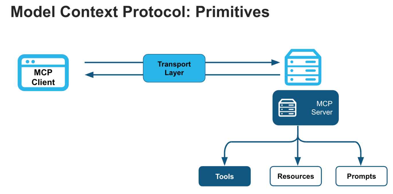 MCP 采用主机-客户端-服务器架构体系。主机是指 Claude Desktop 等 AI 应用程序,它们为 AI 智能体提供运行环境。客户端是这些主机内部的核心组件,负责维护与服务端的直接连接。服务器则为 AI 智能体提供可调用的工具和资源。工具是指可执行函数,例如查询数据库或执行特定任务。