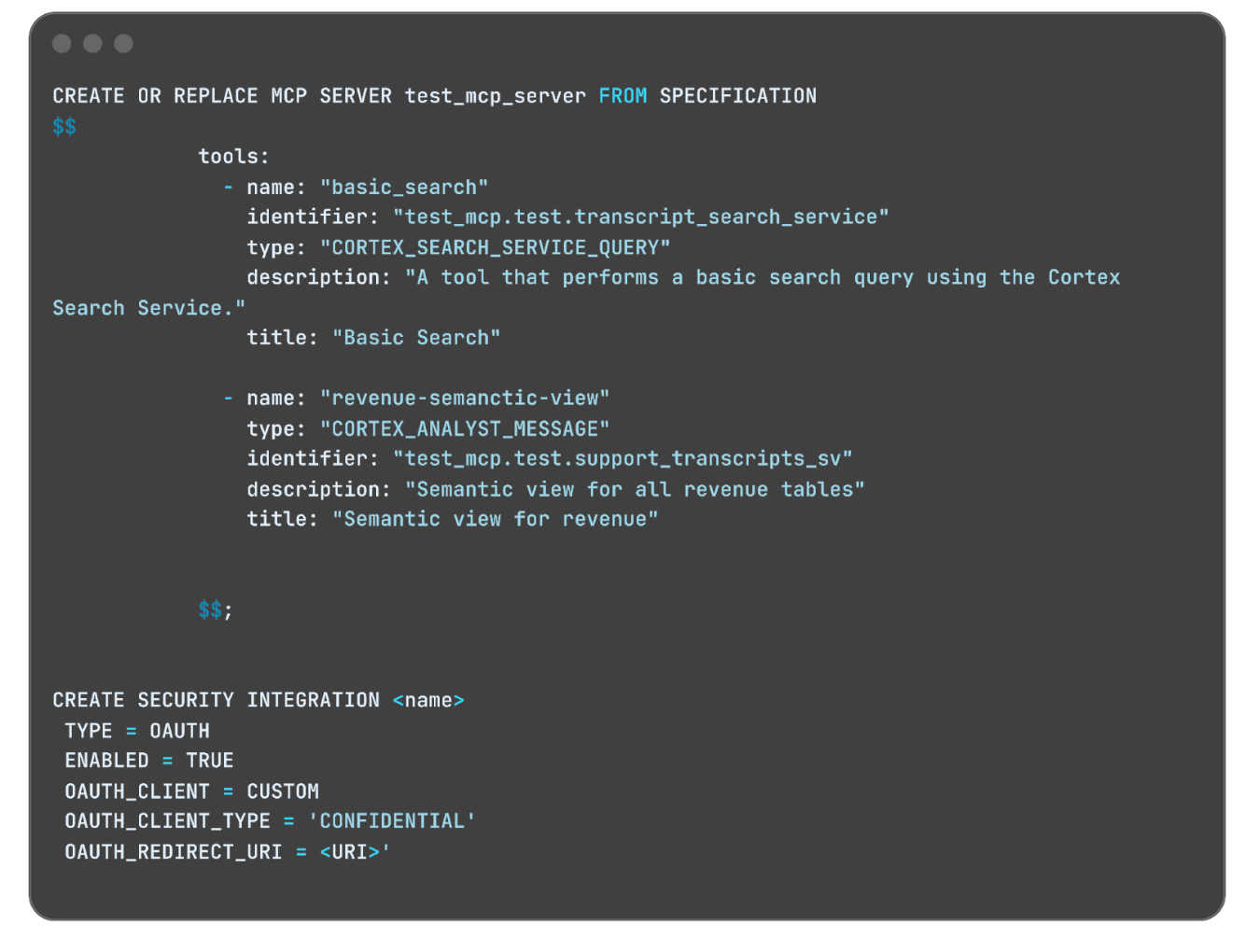 近期我们将在 MCP 服务器中支持 Cortex Agents,使远程应用能够将智能体作为工具调用。客户可根据现有策略和访问控制,在不同数据库模式中定义工具配置,并可在账户内部署多个针对特定用例的 MCP 服务器。这种灵活配置使客户能够在不大幅变更治理模型的情况下,将 MCP 服务器融入 Snowflake AI 数据云体系,提供高精度、高性能的智能体体验。