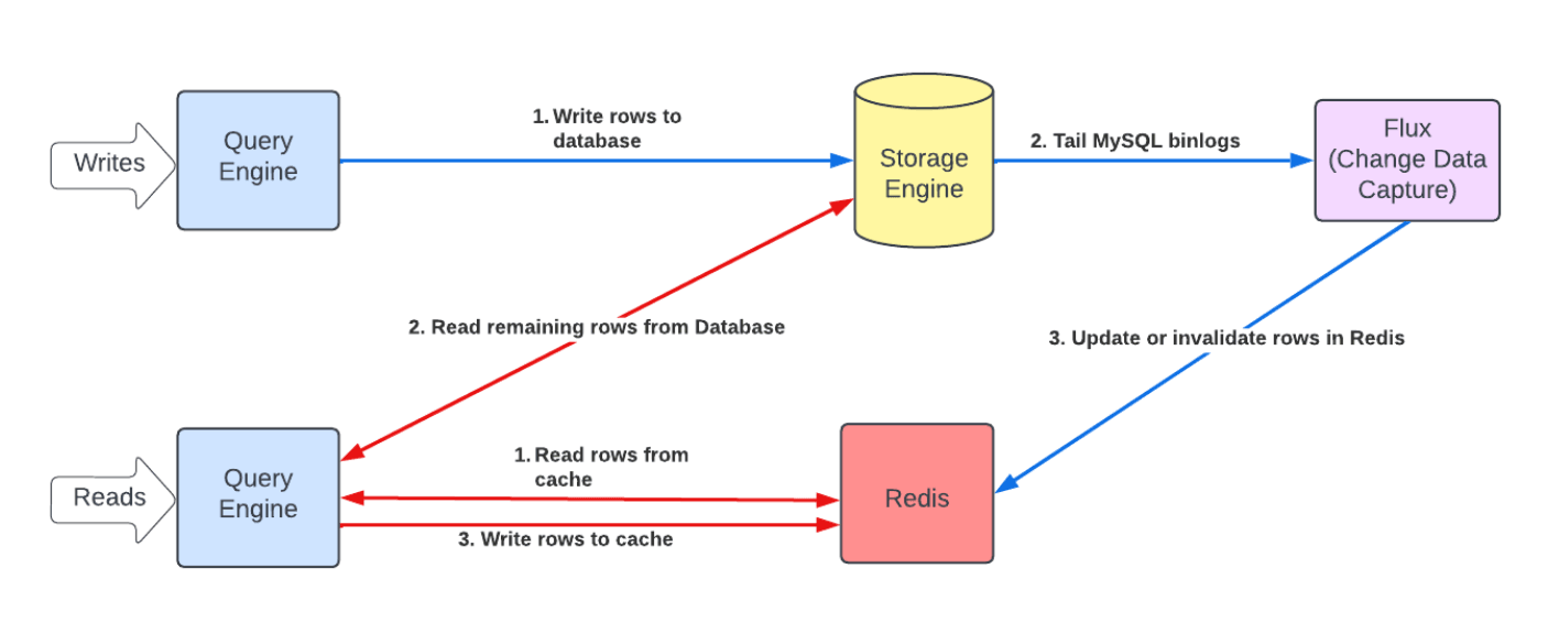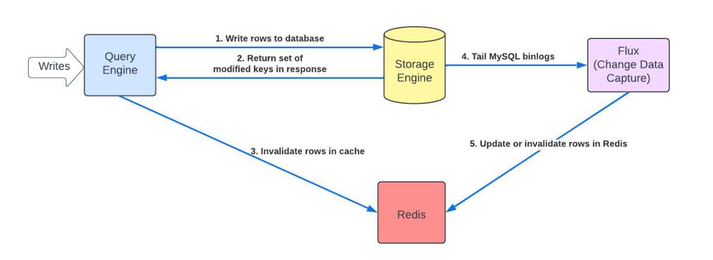 当事务完成时,存储引擎会返回提交时间戳和受影响行键的集合。在这些响应上注册的回调会立即通过写入失效标记来使 Redis 中先前缓存的条目失效。Flux 继续尾随MySQL binlogs并执行异步缓存填充。这三种缓存填充机制:直接查询引擎更新、失效标记和 TTL 过期,结合 Flux 尾随,协同工作以便在支持极高读取吞吐量的同时保持强一致性。