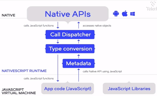 NativeScript 既不是一种新型的 JavaScript 语言,也不是原生功能的封装器,它包括一个 JavaScript 运行时环境和一种将 JavaScript 调用转化为原生调用的机制。用 JavaScript(或 TypeScript,CoffeeScript 等)语言编写应用,之后在安卓平台用 V8,在 iOS 和 Windows Phone 上用 WebKit JavaScriptCore 解释应用。然后,NativeScript 运行时环境找到原生的目标 API,将 JS 数据类型转化为相应的原生类型,然后调用原生 API,并将得到的结果值返回,具体流程如下图所示: