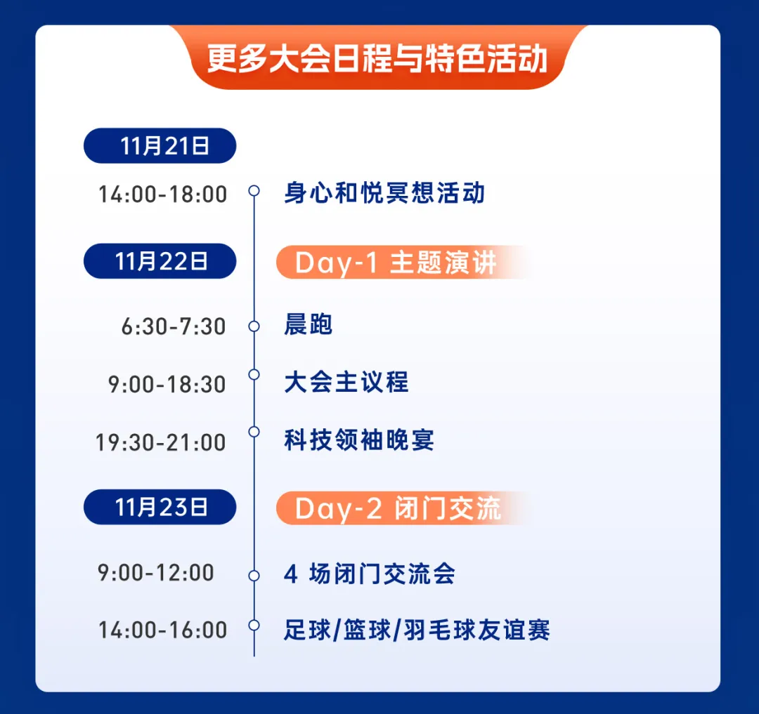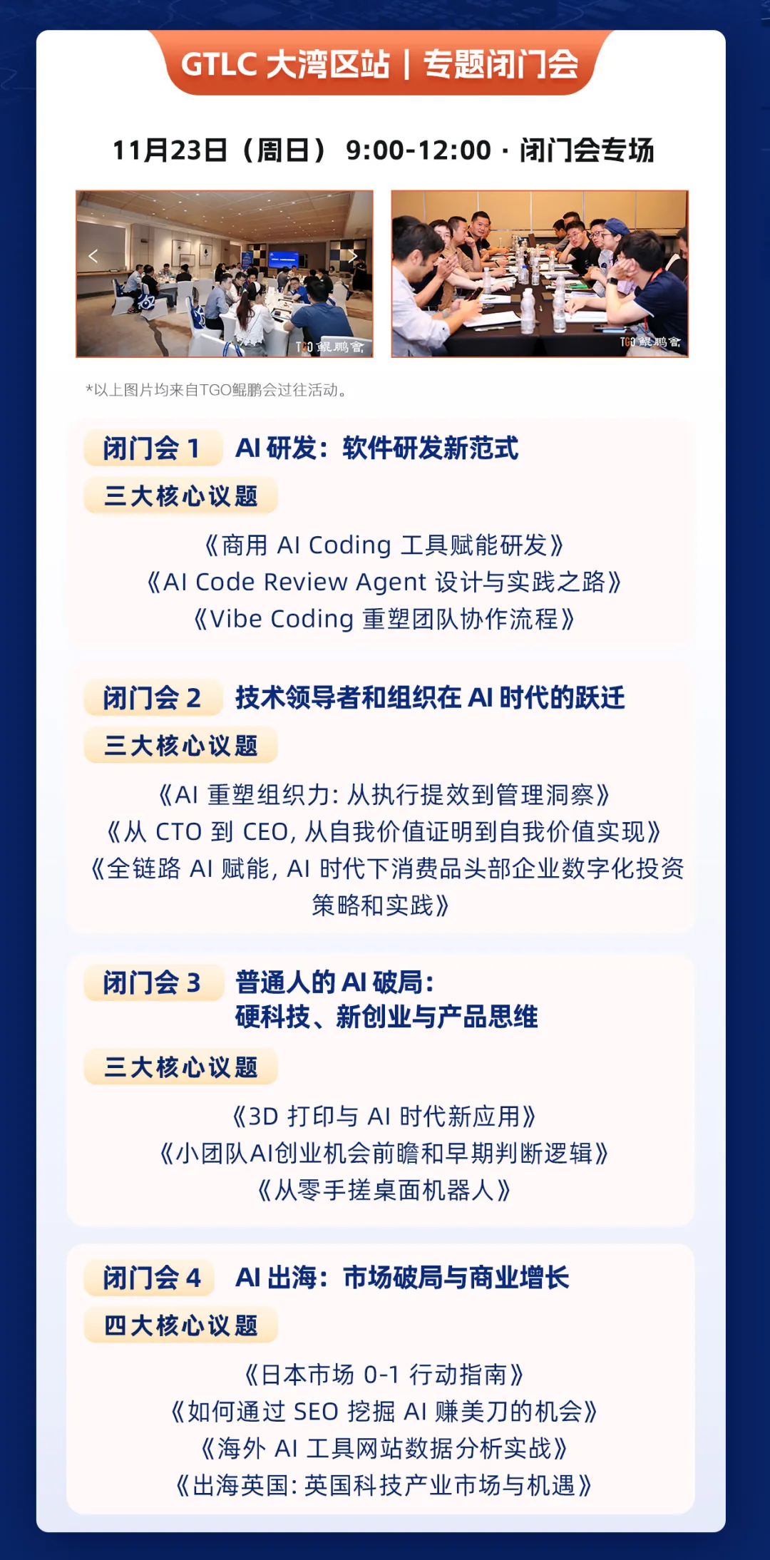 以上仅为 GTLC 大湾区站 11 月 22 日分享主题内容。大会第二天(11 月 23 日,周日),我们再来进行闭门深度交流。闭门交流议程一览👇