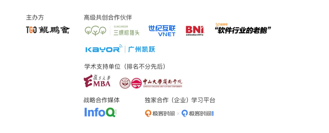 TGO 鲲鹏会是极客邦科技旗下科技领导者同侪学习平台,由极客邦科技创始人霍太稳于 2015 年发起,学员由具有科技背景的公司创始人、CXO、技术 VP、架构师、教授学者和科创投资人等组成,共计超 2000 位 ,在北京、上海、深圳、广州、杭州、成都、南京、厦门、武汉、苏州、台北、硅谷、新加坡等地区定期举办学习活动。TGO 鲲鹏会采用了“学员共建”的组织形式,希望通过“共建、自治”的方式维护各城市的健康发展,为学员提供必要的服务,帮助学员个人更好地学习和成长,助力学员企业之间更好地合作与交流。加入 TGO 鲲鹏会,全方位提升自身价值,成为卓越科技领导者!