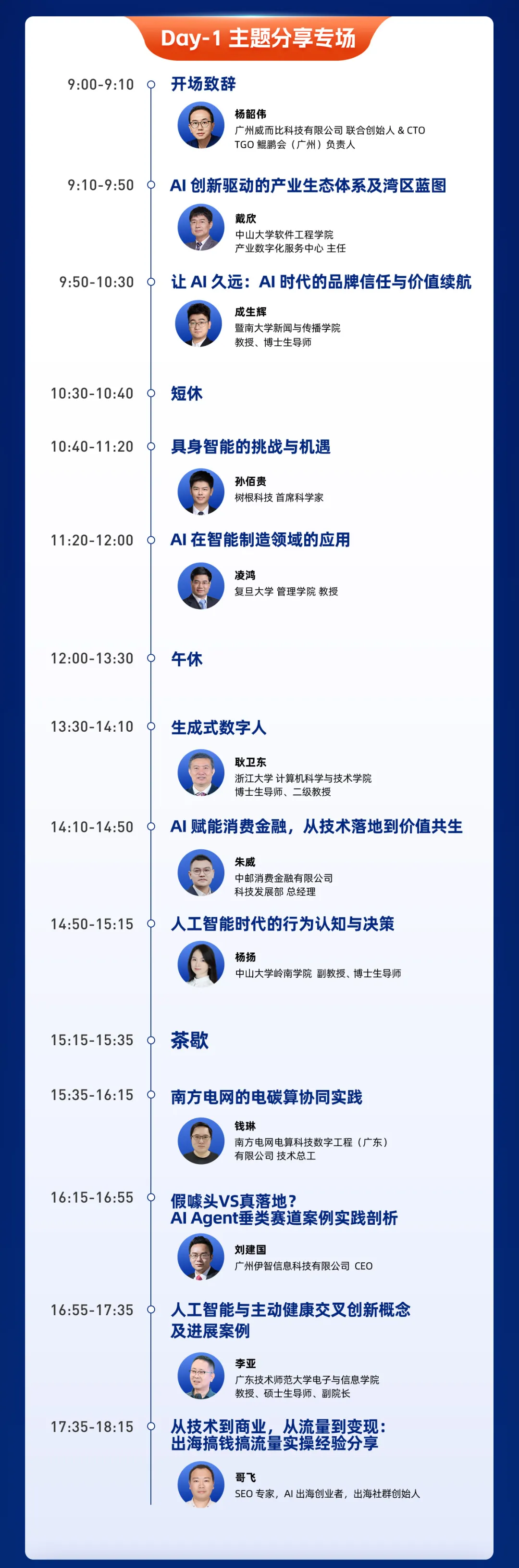 在这样的背景下,我们提出了“AI 全运会,广交同侪”的口号,尝试链接最顶尖的大脑与最具行动力的企业,让 AI 落地不止于概念。2025 年 11 月 22 日即将举办的 GTLC 全球科技领导力大会·大湾区站,正是肩负着这样的使命而来。