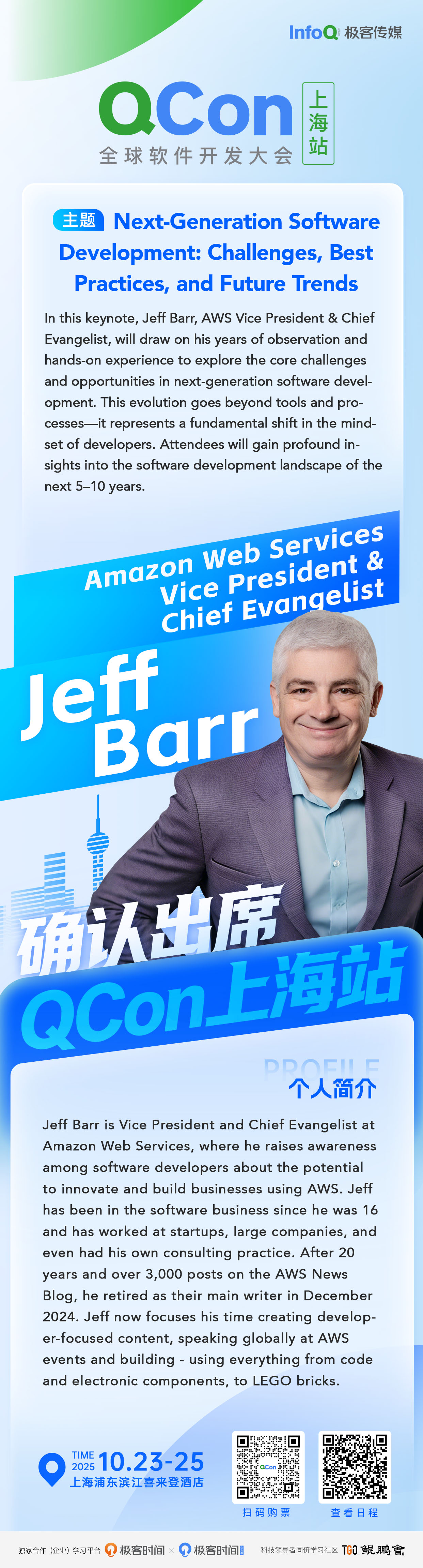 在此背景下,Jeff Barr 即将于10月回归QCon舞台,这注定将是一个新的里程碑事件。这一次,他面对的是一个在规模、创新速度和 AI 落地上都走在世界前列的开发者市场。对 Jeff 来说,这不仅是一场久违的重逢,更像是一场见证中国技术力量崛起的回归之旅。