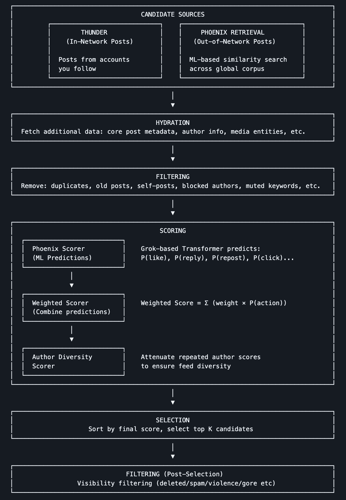 此次开源的算法的核心是系统使用一个 Grok-based Transformer 模型(类似大型语言模型/深度学习网络)对每条候选帖子进行评分。Transformer 模型根据用户的历史行为(点赞、回复、转发、点击等)预测每种行为的概率。最后,将这些行为概率加权组合成一个综合得分,得分越高的帖子越有可能被推荐给用户。