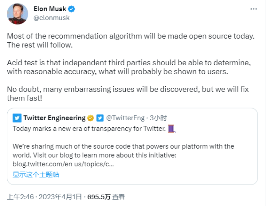 当时,马斯克在 Twitter 上表示此次发布的是“大部分推荐算法”,其余的算法也将陆续开放。他还提到,希望“独立的第三方能够以合理的准确性确定 Twitter 可能向用户展示的内容”。
