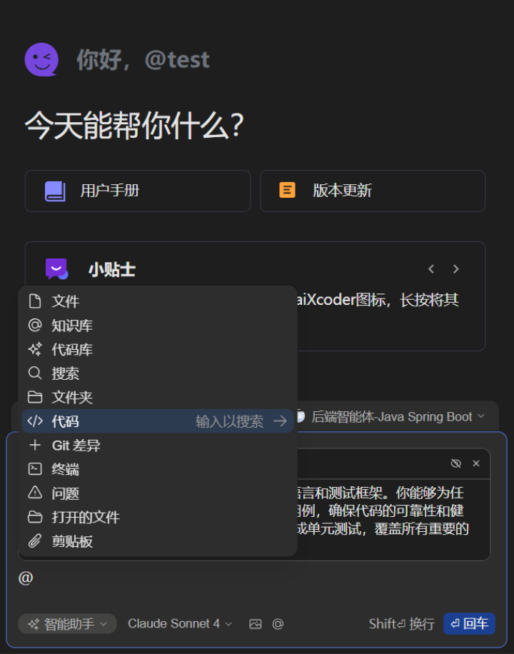 aiXcoder 7.0 具备强大的上下文感知能力,开发者在对话框通过 @键即可快速调用多元上下文资源,包括文件、企业知识库、代码库、搜索、Git 差异、终端、剪切板等十余种上下文类型,实现精准信息匹配。