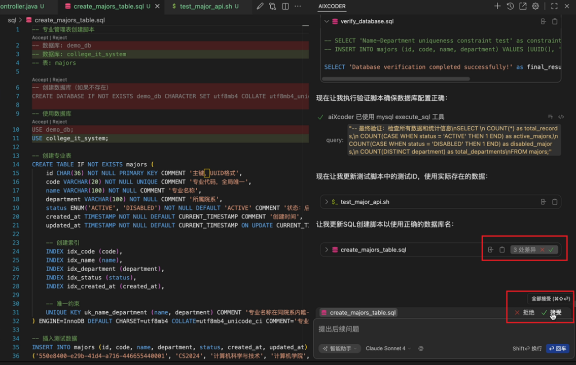 代码修改后:人工复核,一键接受或拒绝。由 Agent 生成的代码修改,都会以清晰的 Diff 视图直观呈现。开发者对代码变更情况一目了然,可通过“接受”和“拒绝”行使决策权,确保代码质量与可靠性。