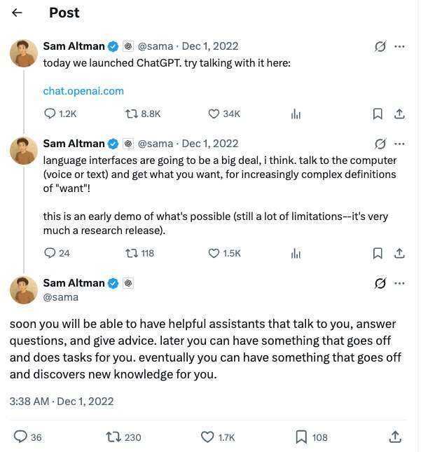 三年前的今天,山姆·奥特曼在凌晨发出几条推文,向世界介绍了一个名为 ChatGPT 的“早期演示”。他预言,人们很快将拥有能够交谈、答疑、提供建议的“帮助性助手”,未来它甚至能“为你发现新知识”。字里行间,充满了对技术赋能人类未来的纯粹憧憬。