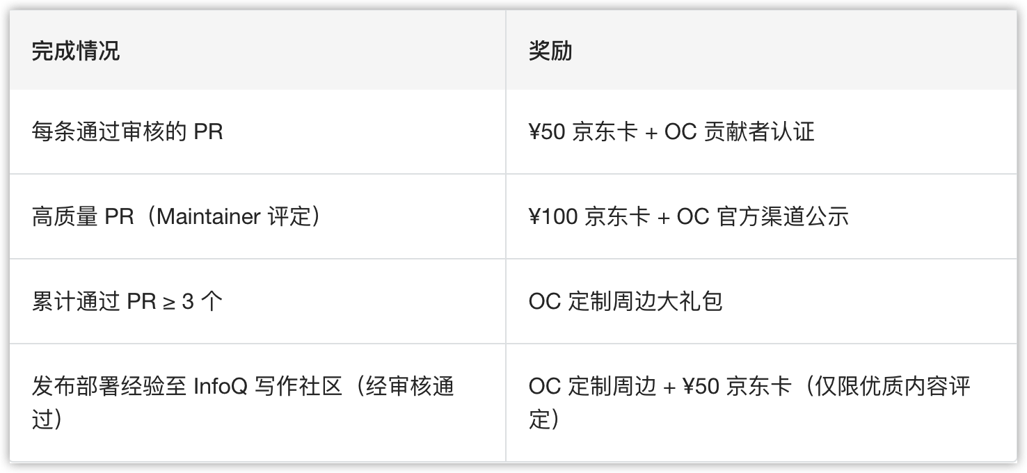 PR 审核通过后,将部署心得(600-1000 字)发布至 InfoQ 写作社区。经审核通过即可额外获得 OC 定制周边,优质内容可获得 ¥50 京东卡。