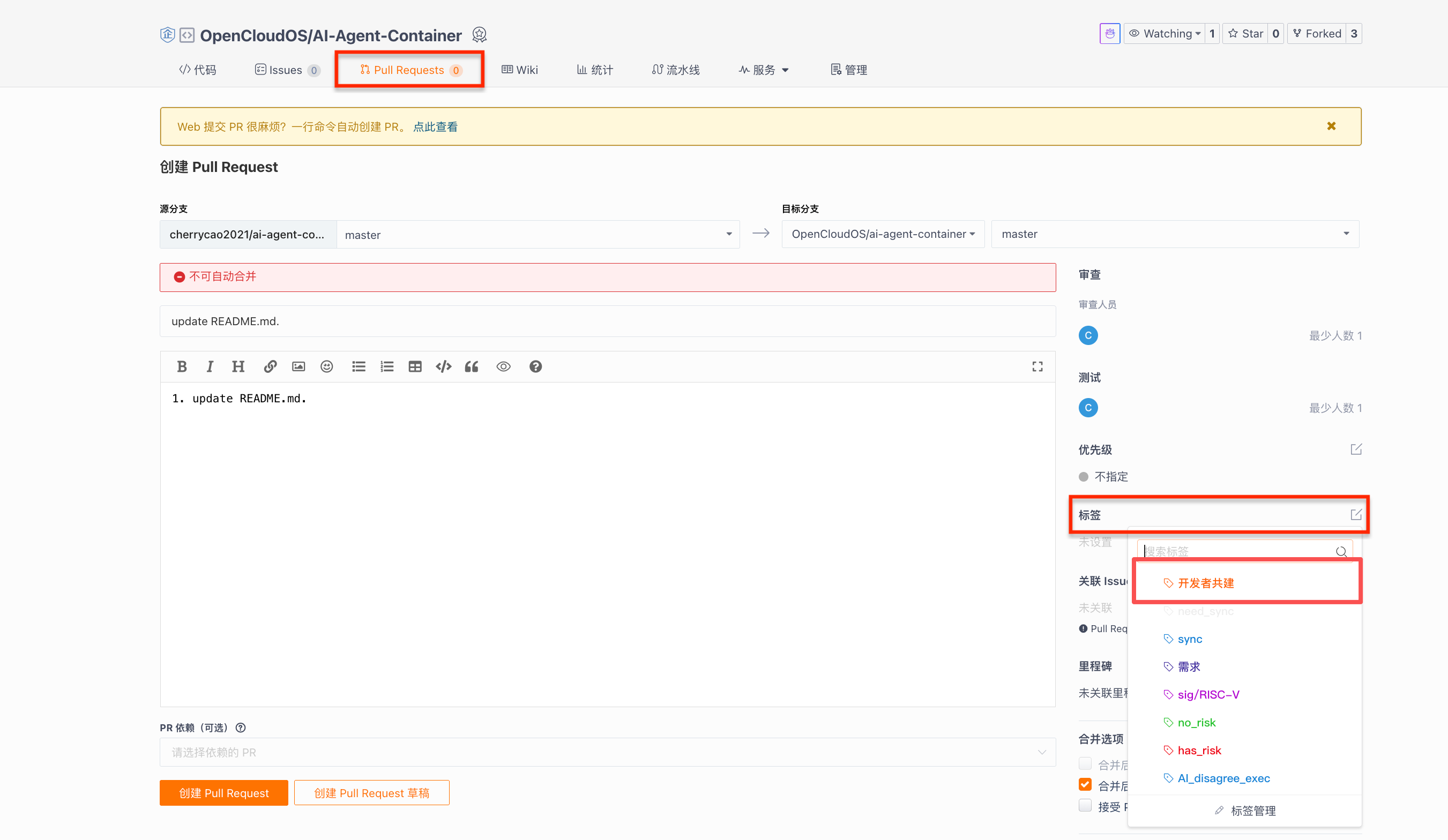 在「OC9 AI 容器镜像共建」创建 「Pull Request 」页面右侧,找到「标签」一栏,搜索并勾选「开发者共建」标签后再提交。