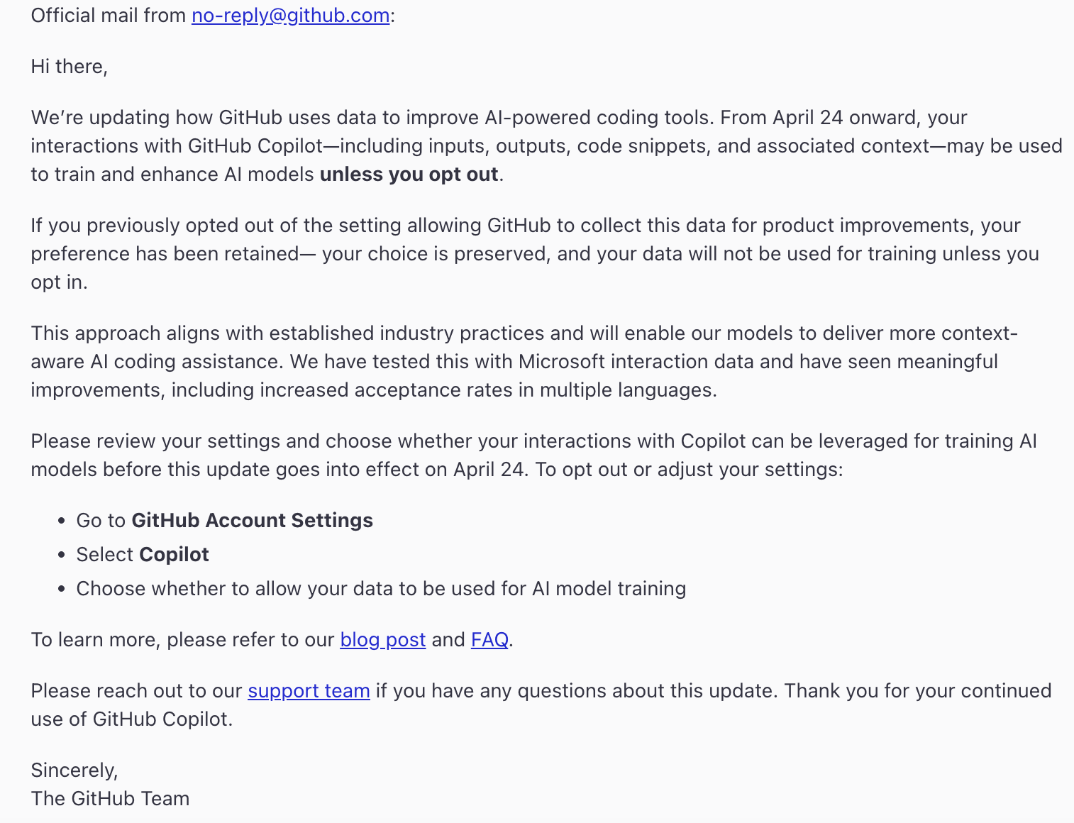 GitHub 对这项调整的解释是,Copilot 的使用量正在快速增长,模型需要更多“真实世界数据”来覆盖越来越多的编码场景。