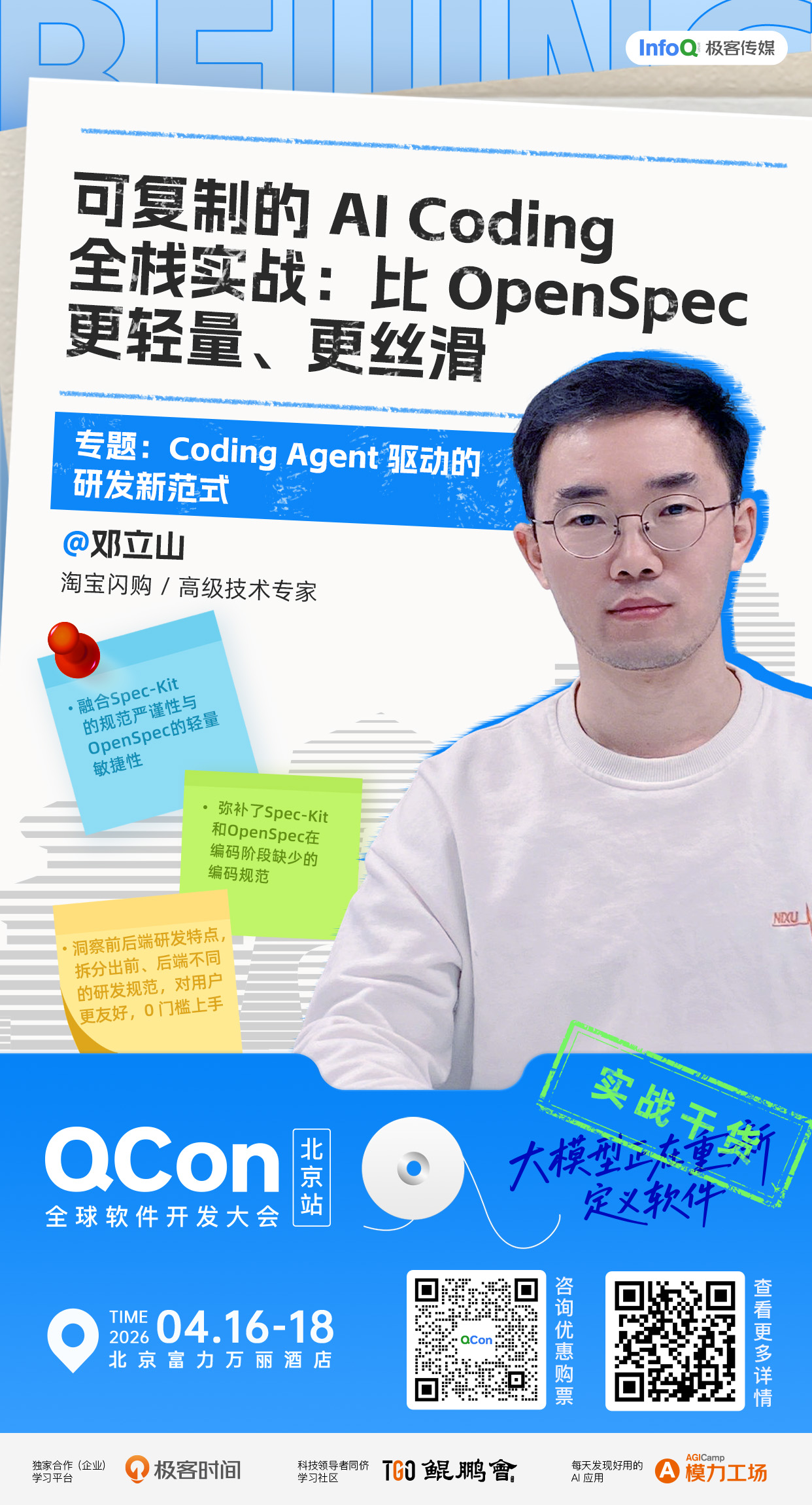 淘宝闪购高级技术专家邓立山已确认出席 “Coding Agent 驱动的研发新范式” 专题,并发表题为《可复制的 AI Coding 全栈实战:比 OpenSpec 更轻量、更丝滑》的主题分享。面对 AI 编码实践中暴露出的研发流程低效(如需求理解偏差、多轮调试)和编码质量不可控(如单文件臃肿、代码纠缠、前后端耦合、缺乏架构约束)两大核心问题,淘宝闪购团队一直在持续不断的迭代优化实践经验,前期实践分享无论在内网还是外网都获得广泛认可。本次分享结合团队实战经验,融合 Spec-Kit 的规范严谨性与 OpenSpec 的轻量敏捷性以及当前主流技术,创新提出 “Rules + Spec + Skills”三位一体全栈 AICoding 架构,进一步提高研发效率。
