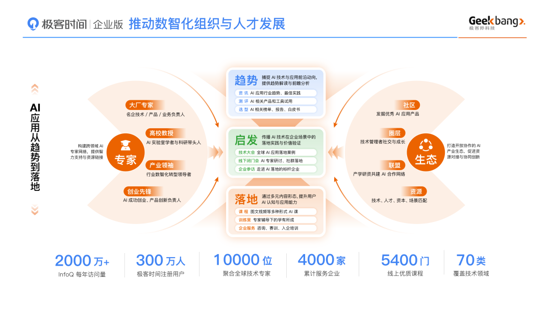 极客时间企业版致力于为企业打造行业领先的数智化人才团队,驱动企业数字化转型与高质量发展。为企业数智化人才培养提供高质量课程、智能化学习平台、系统化培训解决方案和全生命周期的顾问式服务。目前已服务 3000+ 家数字化企业,覆盖银行、证券、保险、金融科技、汽车、移动通信、软件、工业制造、零售等行业客户。