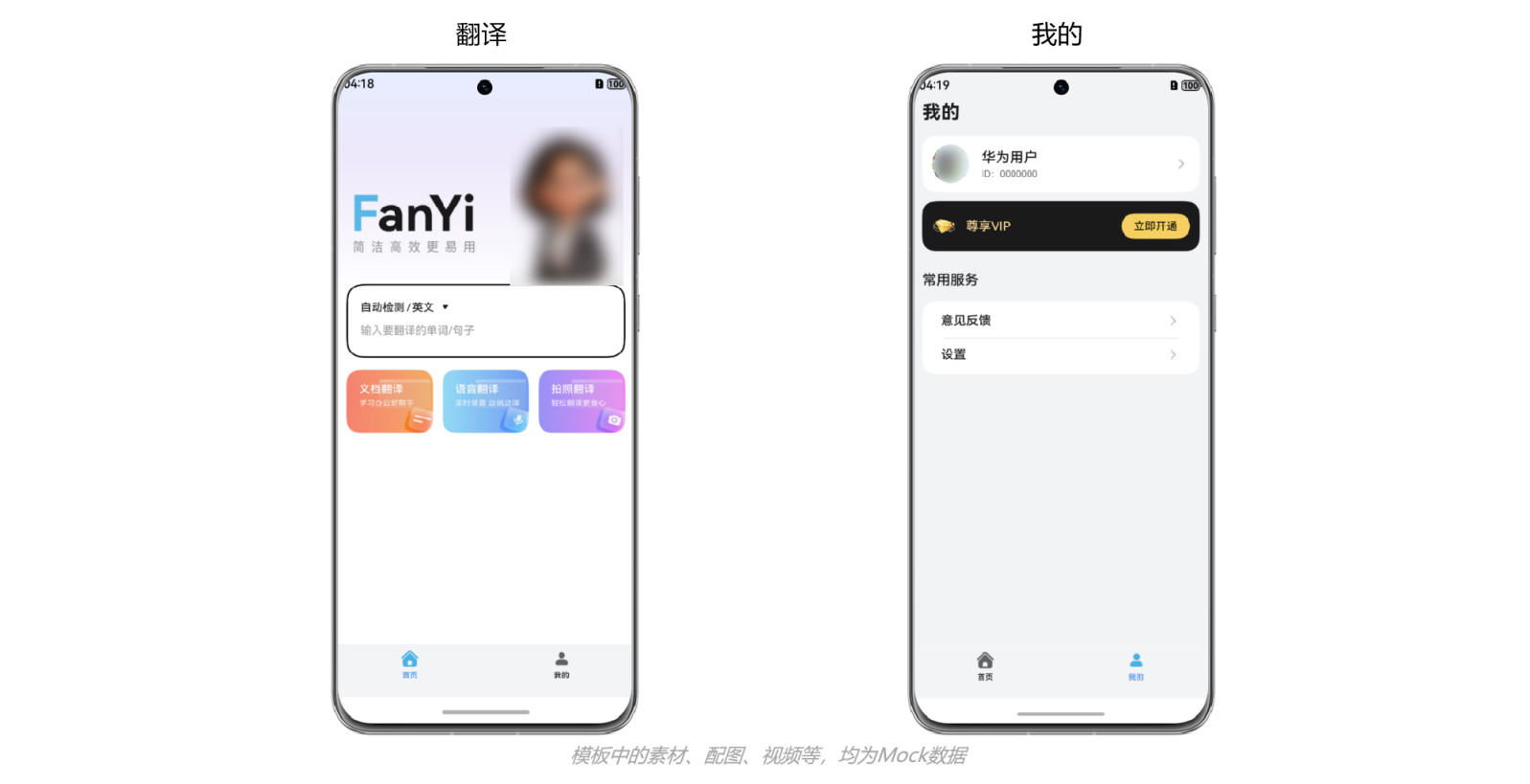 本模板为翻译类应用提供了完整的开发框架,模板主要分翻译和我的两大模块。模板已集成华为账号登录、百度翻译 API、语音识别、文本朗读等服务,只需做少量配置和定制即可快速实现翻译应用的核心功能。
