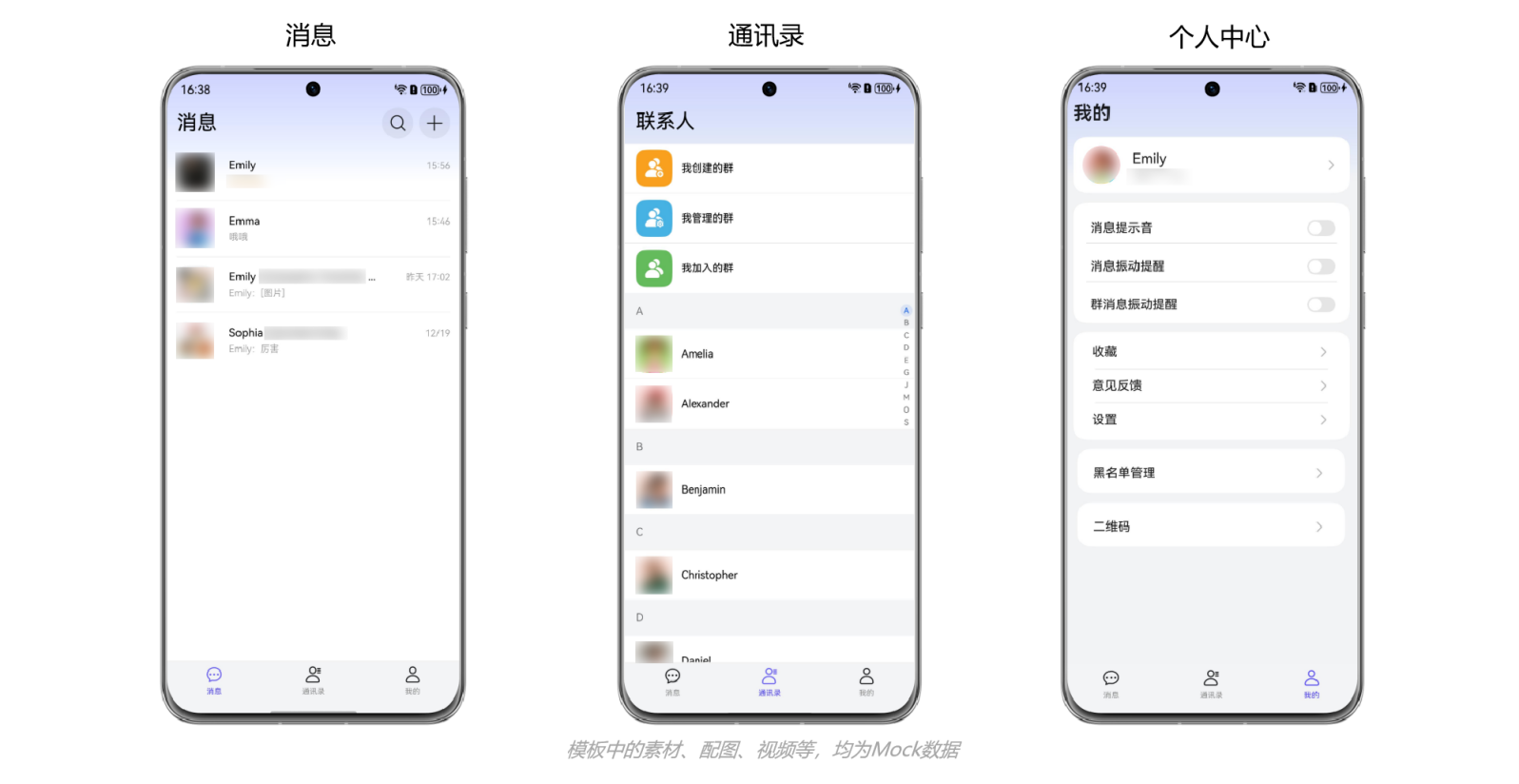 本模板为社交交友类应用提供了常用功能的开发样例,模板主要分消息、通讯录和个人中心三大模块。模板已集成华为账号、腾讯云即时通信 IM、地图展示、麦克风语音录制、视频图片等相机拍照服务,支持深色模式、适老化、无障碍等特性,提供完整的社交应用解决方案,只需做少量配置和定制即可快速实现社交应用的核心功能。