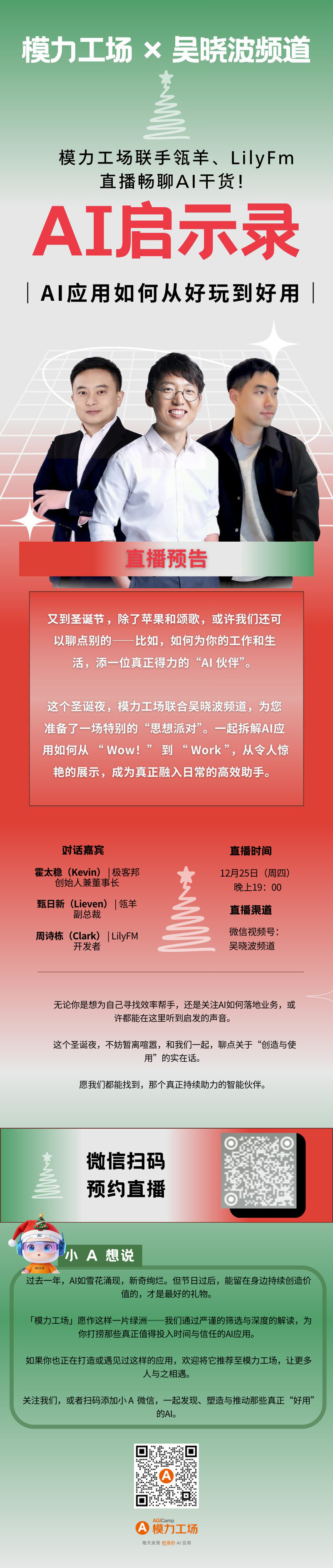 这个圣诞夜,模力工场联合吴晓波频道,为您准备了一场特别的“思想派对”。一起拆解 AI 应用如何从 “Wow!” 到 “Work”,从令人惊艳的展示,成为真正融入日常的高效助手。