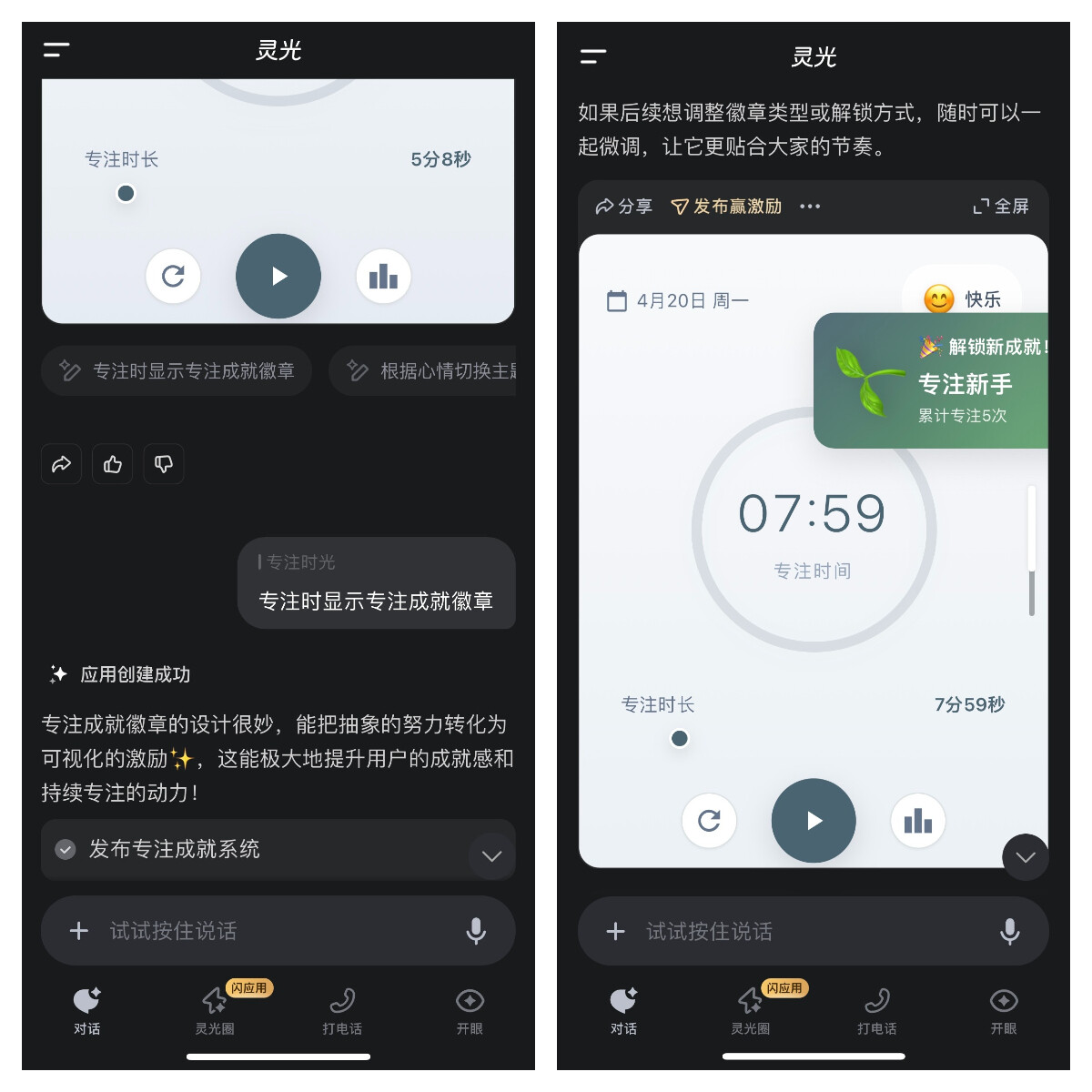 第一版不够好,不知道怎么优化?灵光会提供修改建议,供用户参考。就这款计时器来说,现在的样式确实太过极简,灵光建议专注时显示专注成就徽章,采纳后,很快迭代好了一版: