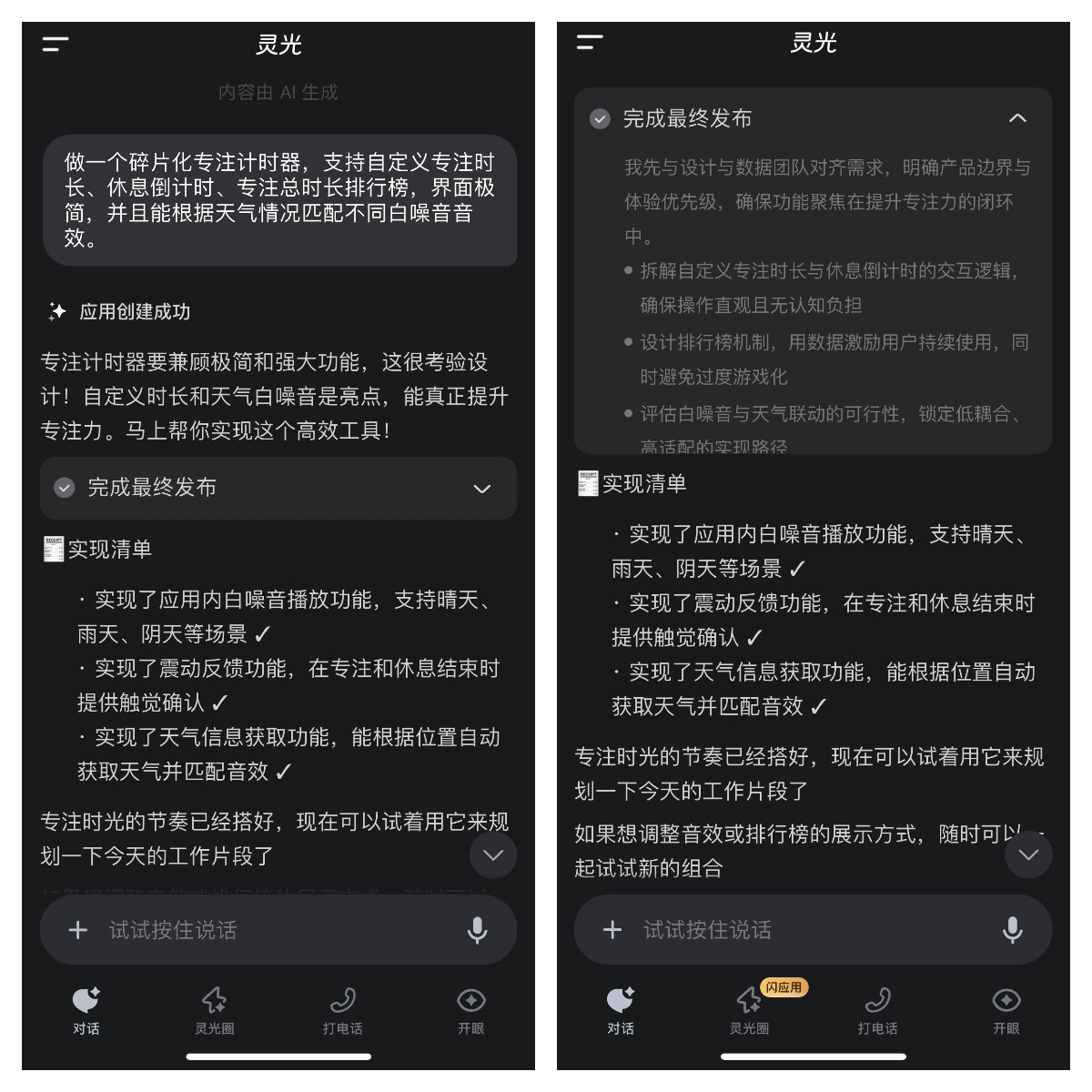 把这些“愿望”一股脑儿发给灵光,几十秒就得到了一个应用,直接就能体验起来。整个过程,全部都是在灵光 APP 里完成。