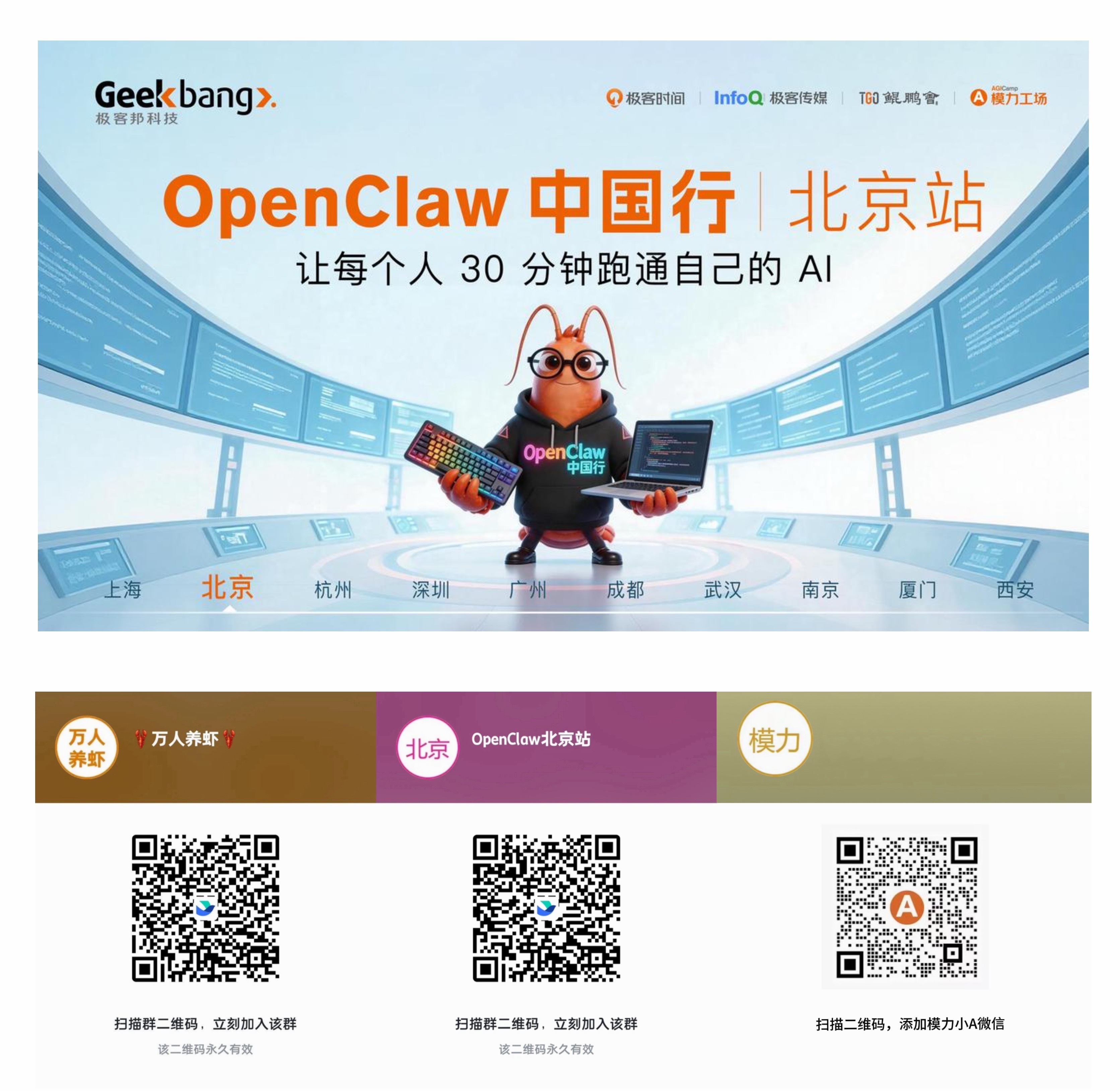 OpenClaw 的火爆还在持续,但与其隔着屏幕围观,不如带上电脑来现场——OpenClaw 中国行来了,模力工场倾力参与其中,就是想让每个人都能 30 分钟跑通自己的 AI,从公益装机到应用实战,从项目闪电秀到工具市集,再到和真正的开发者聊聊天,我们用一下午的时间帮你迈出第一步。3 月 15 号北京站已开放报名,3 月 21 号杭州站即将开启,飞书扫码进群了解更多,或者直接添加模力小 A 企业微信,回复关键词【龙虾】直接进群。