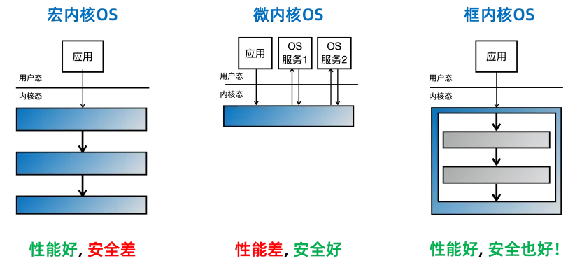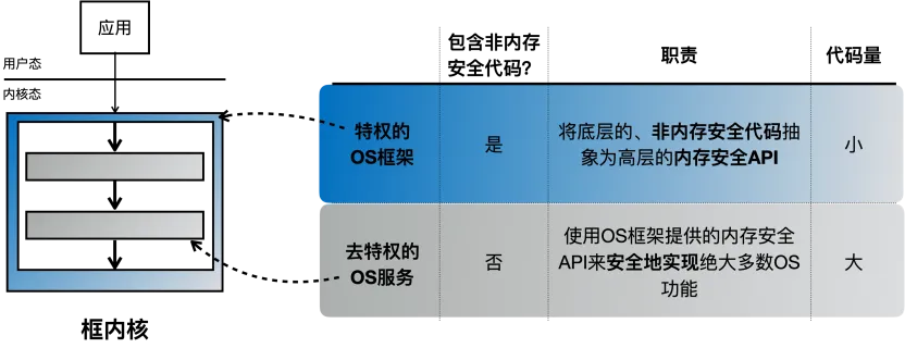 虽然两大架构各具优势,但其实,不论选择哪一种,都会陷入两难困境:宏内核虽然在性能上表现优越,但由于代码量庞大且用 C/C++ 等内存不安全的语言编写,导致系统频繁暴露于安全漏洞中,其中约有 70% 都是由内存安全问题引起的,安全性较差;微内核由于在最高权限级别只保留了最少的代码,安全性大幅提升,但低权限 OS 组件需要频繁的跨进程通信,从而导致性能下降。