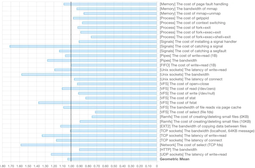 在经历了长达五年的技术探索后,2024 年 10 月 22 日,中关村实验室、蚂蚁集团、北京大学、南方科技大学等产学研机构联合对外发布星绽,并向全球开发者开源。在 LMbench 基准测试上,星绽 OS 已经达到与 Linux 相当的性能水平,平均达到了 1.05(数值表示相对于 Linux 的性能,大于 1.0 表示星绽优,小于 1.0 表示星绽劣)。更重要的是,星绽 OS 并未因提升安全性而牺牲性能,这点尤为难得。