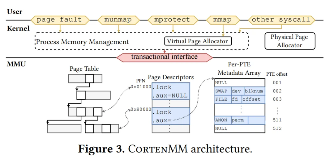 架构层面,CortenMM 为每个页表页关联一个页描述符,这些描述符在操作系统启动时分配于连续内存区域,每个描述符通过对应页表页的物理页号进行索引,其结构包含:用于自我保护的锁、对应的页表页指针,以及按页表条目偏移量索引的元数据数组。该元数据数组按需分配,随对应页表页一同释放,用于存储实现高级语义所需的最小状态。此外,基于单层抽象的简洁特性,CortenMM 进一步设计了可扩展的直观并发控制机制,引入事务型接口,并将其作为操作内存管理单元的唯一途径。