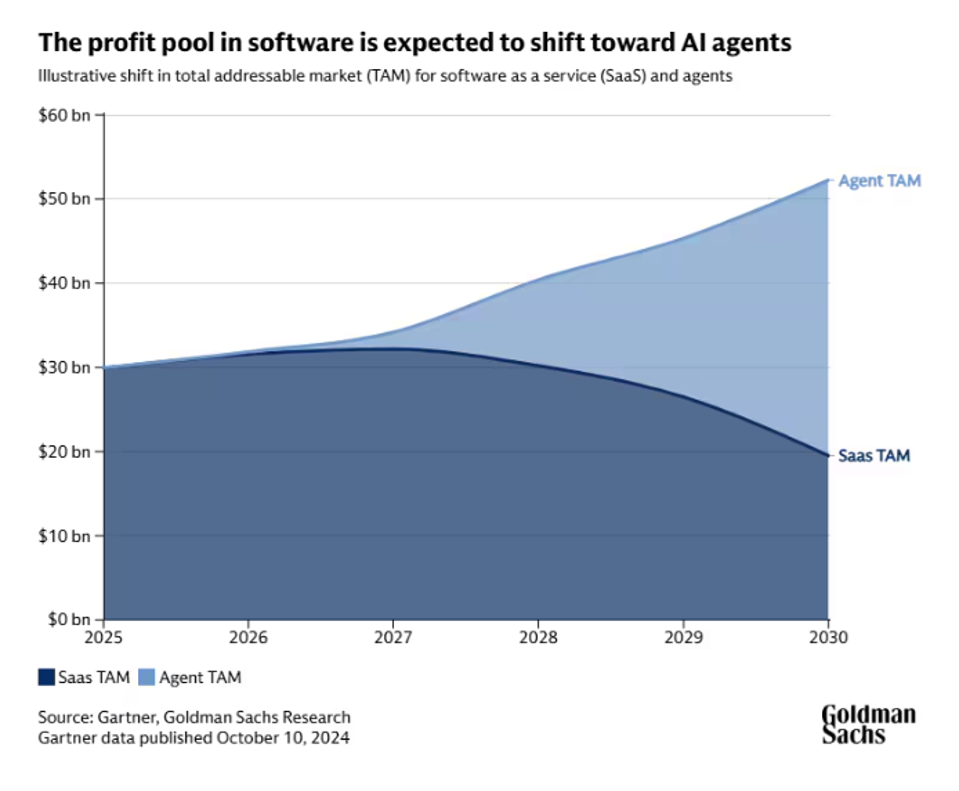高盛近期的一项研究预测,到本十年末,人工智能代理将显著扩大整个软件市场,并攫取不成比例的利润份额。在他们的框架下,代理不仅仅是增强应用程序的功能,它们本身就成为了工作界面。到 2030 年,超过 60%的软件经济效益可能会通过 Agent 系统而非传统的 SaaS 服务实现。