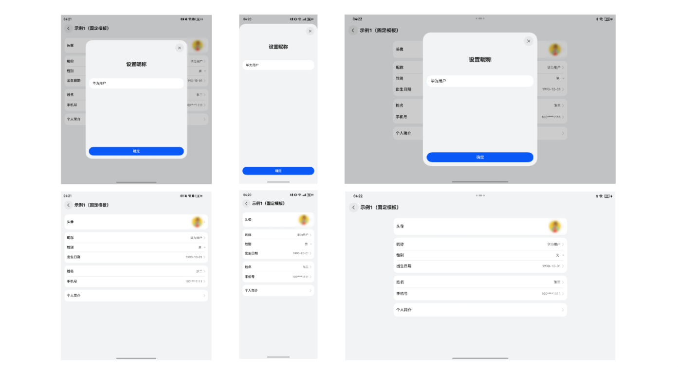 本组件支持编辑头像、昵称、姓名、性别、手机号、生日、个人简介等,已完成一多适配开发。