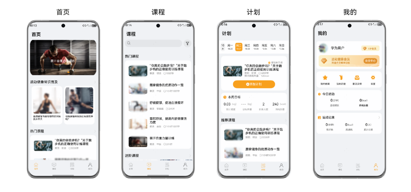 本模板为运动健身类应用提供了常用功能的开发样例,模板主要分首页、课程、计划和我的四大模块。模板已集成华为账号等服务,只需做少量配置和定制即可快速实现华为账号的登录、媒体播放等功能。
