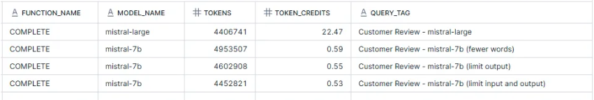 通过使用更小的模型,并将评论文本限制在 500 个字符以内、输出内容限制为不超过 10 个词,最后一次运行 [Customer Review — mistral-7b (limit input and output)] 显著减少了 token 的使用量。同时,它在整个过程中仍保持了模型的准确性。