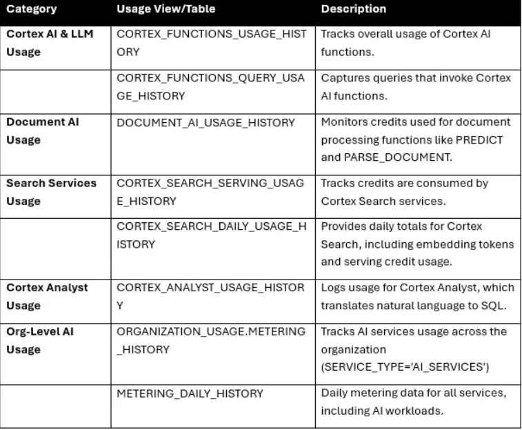 为支持这一转变,Snowflake 现通过 ACCOUNT_USAGE 视图开放 AI 使用遥测数据: