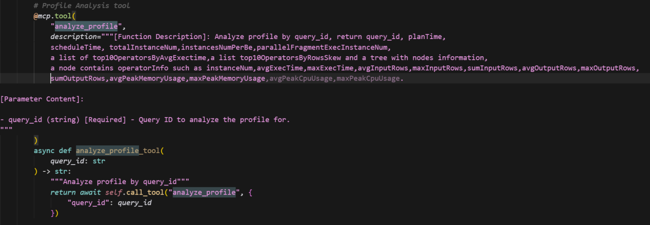在本场景中,团队主要使用 Apache Doris 的 MCP,并进行了大量优化,以满足实际需求。例如,增加了用于获取 Profile 的工具、提取 Task 信息的工具及分析审计记录的工具。同时,还将这些工具与自研的 Profile 可视化工具集成到 MCP 中,使其可在 MCP 体系内被调用。下图展示了 MCP 工具扩展的部分示例: