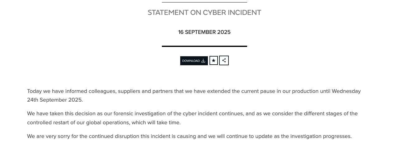 捷豹路虎在 9 月 16 日的公告中表示“我们对此次事件造成的持续中断感到非常抱歉”,这也是该公司自 9 月 10 日承认这起事故以来发出的首份公告。