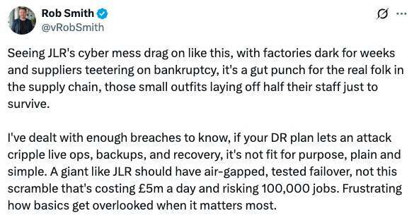 外界的耐心正在消磨,批评声愈演愈烈。网络安全专家同样毫不留情。Techzura 总经理 Rob Smith 在 X 上直言:“我处理过大量安全漏洞。如果灾难恢复计划在攻击下全线瘫痪,那它就是无效。像捷豹路虎这样的巨头,本该有隔离方案和故障转移演练,而不是眼睁睁让自己每天亏掉 500 万英镑,把 10 万个工作岗位都拖入险境。”