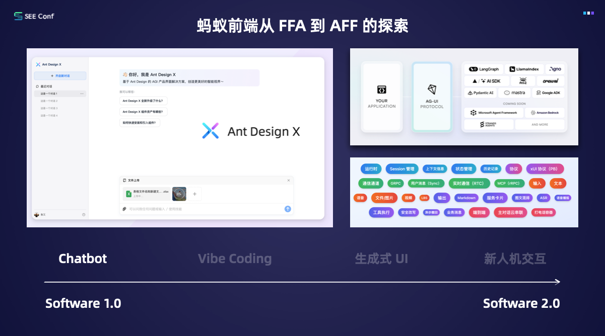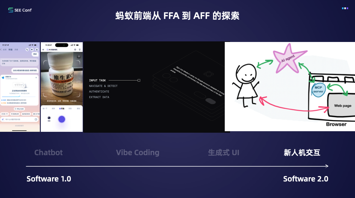 参考从 FFB 到 BFF 的历史演进,偏右在演讲中提出,前端在 AI 时代也会经历类似的路径:从 FFA(Front-end for AI) 走向 AFF(AI for Front-end)。在这条路径中,他将蚂蚁的探索分成了四个连续的阶段,每一阶段都代表着前端在软件 2.0 环境下能力边界的进一步外溢。