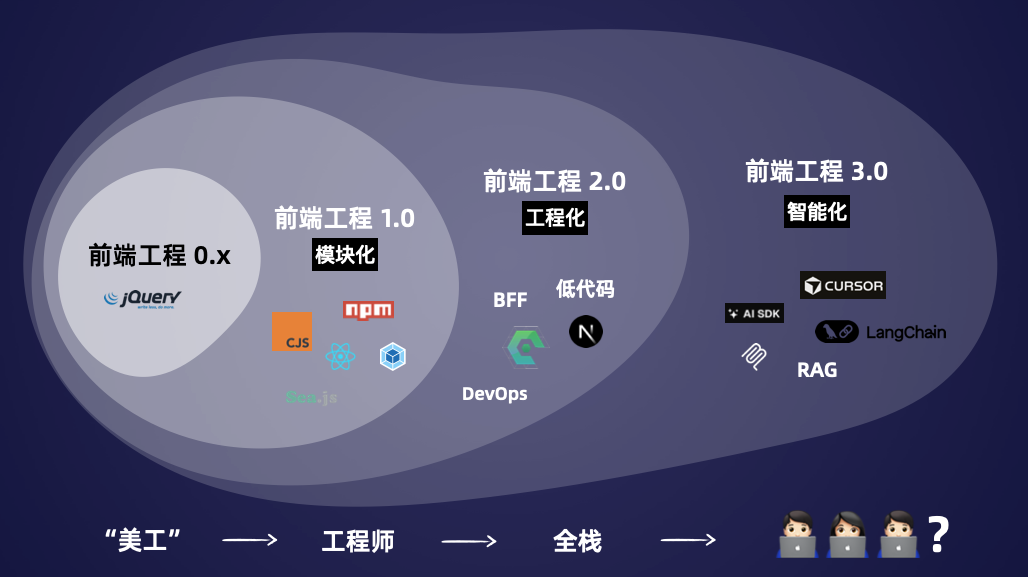 这一阶段的核心变革在于,前端彻底摆脱 “仅编写页面” 的单一定位,建立起完整的工程化方法论 —— 从代码构建、依赖管理到组件抽象、版本控制,每一环均需要系统化设计与规划。正是通过工程化转型,前端第一次在技术复杂度、研发规范性上,与传统软件工程师站在同一水平线,真正确立了 “软件研发核心环节” 的地位。