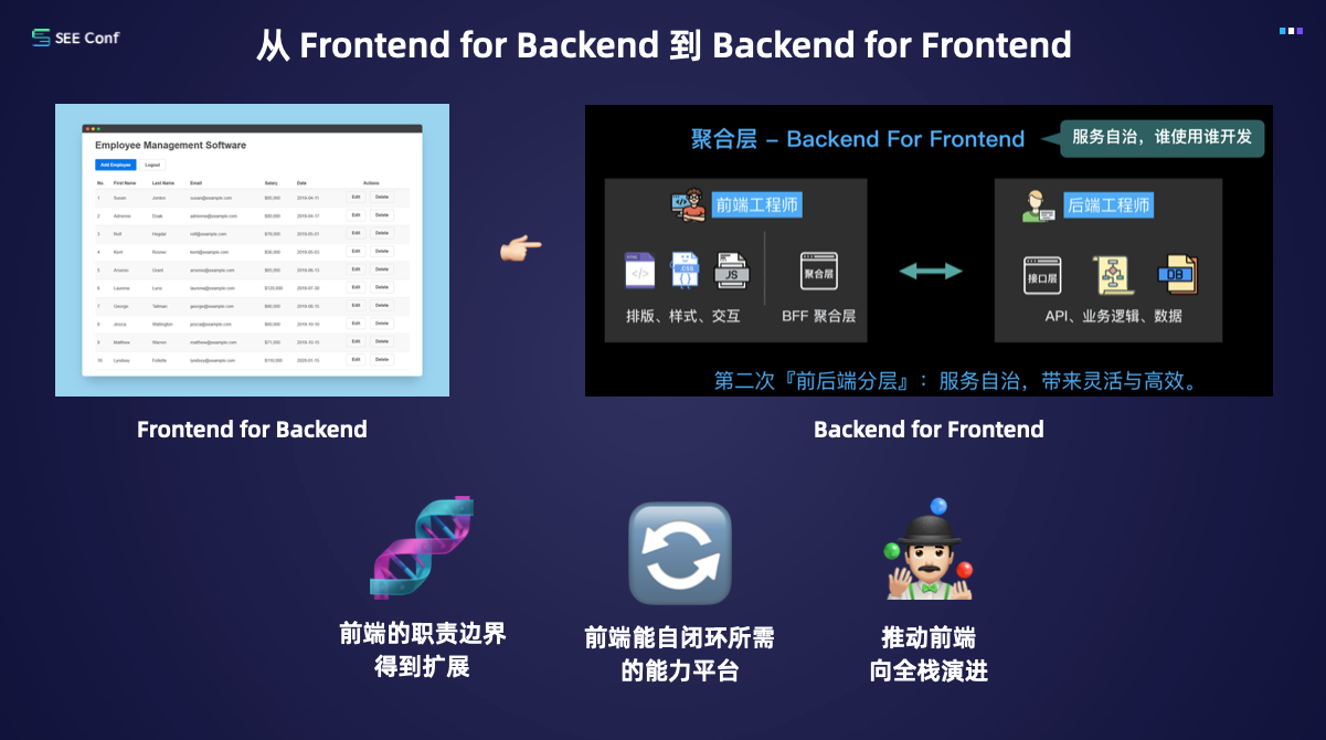 广义 BFF 阶段:当前端具备服务端开发能力后,不再局限于 “胶水层” 角色,而是以用户体验为核心,整合全链路技术资源,形成前端主导的服务层设计视角,彻底打开了前端的技术格局。