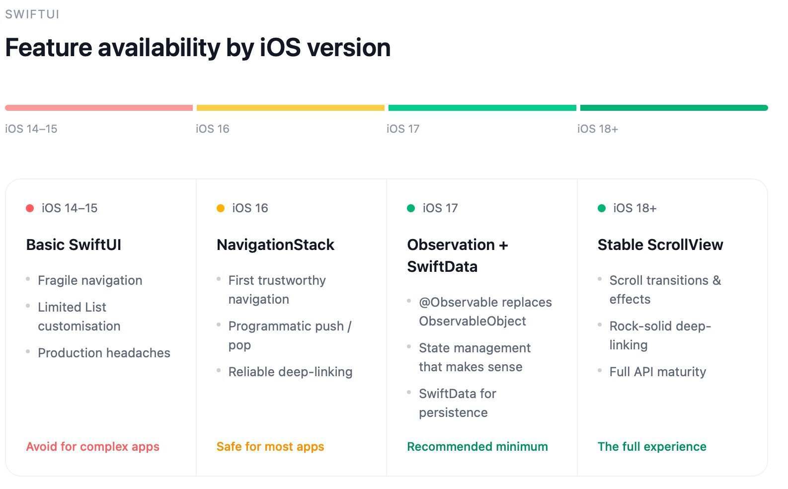 旧系统支持:iOS 16 以下没有 NavigationStack;iOS 17 以下没有 Observation 框架和 SwiftData。最好用的 SwiftUI 必须搭配最新的 iOS,这是一个你必须规划适应的约束,并不是靠一厢情愿就能消除的。