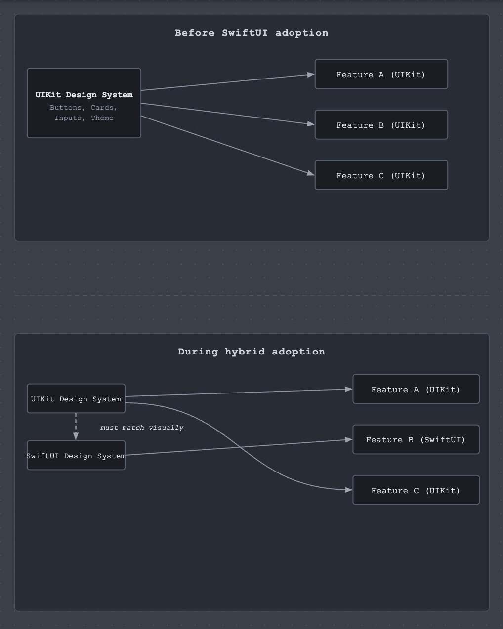 如果你的应用已经有成熟的设计系统(任何大规模正规应用都会有),落地 SwiftUI 实际上意味着要从头重建一套。团队日常依赖的 UIKit 组件,比如按钮、卡片、输入框、字体、主题,它们都不会自动变成 SwiftUI 视图。你必须从零重构,保持两套视觉完全一致,并在设计迭代时始终做到完美同步。