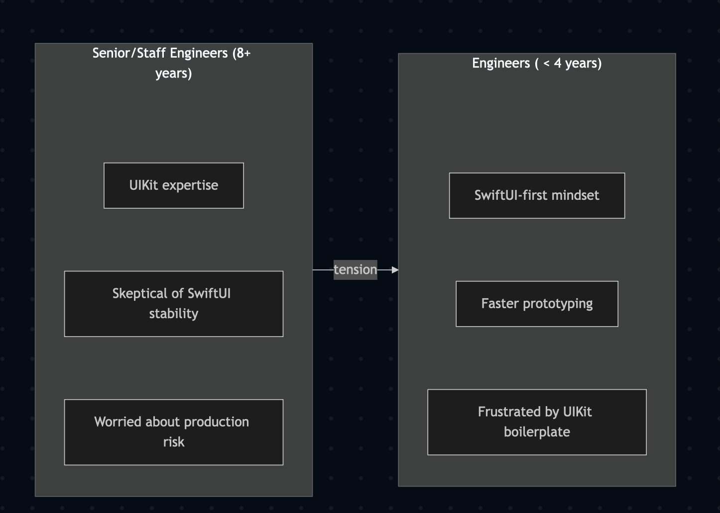大规模落地 SwiftUI 的挑战并不在于框架本身,框架本身没问题。挑战在于技术与必须使用它的工程师之间;在于说服资深工程师放弃一套运行良好的方案时涉及的团队博弈;在于那些没人提前提醒过的权衡取舍;在于和产品经理沟通,他们无法理解,为什么一个功能突然要求 iOS 17,而你一半的用户还在用 iOS 15。