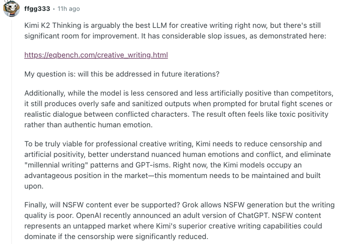 “Kimi K2 Thinking 是目前最好的创意写作(creative writing)模型之一,但还有提升空间。”
