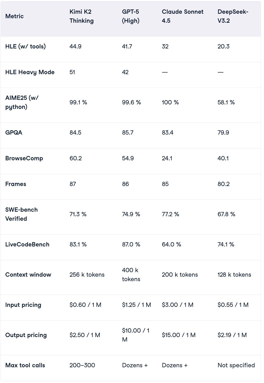 它基于 Kimi K2 打造,延续并超越 DeepSeek R1 的架构——万亿级 MoE、原生 INT4、256k 上下文,一次可稳定完成 200 多次工具调用,让开源阵营的“思考引擎”首次具备正面对抗闭源巨头的底气。
