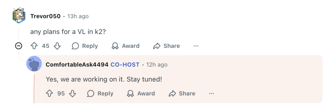 此外,还有网友提出 K2 未来是否会推出 视觉语言模型(VL),杨植麟给出肯定答复: