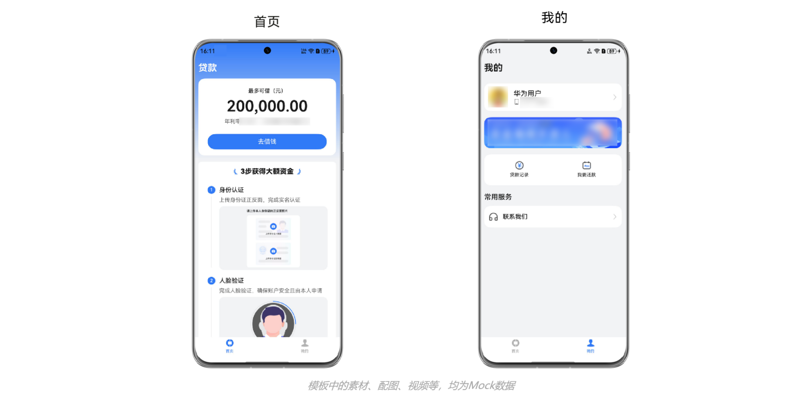 本模板为贷款类应用提供了常用功能的开发样例,模板主要分首页、我的两大模块。模板已集成华为账号、微信登录、华为支付、微信支付、支付宝支付等服务,只需做少量配置和定制即可快速实现华为账号的登录、贷款申请与还款等功能。