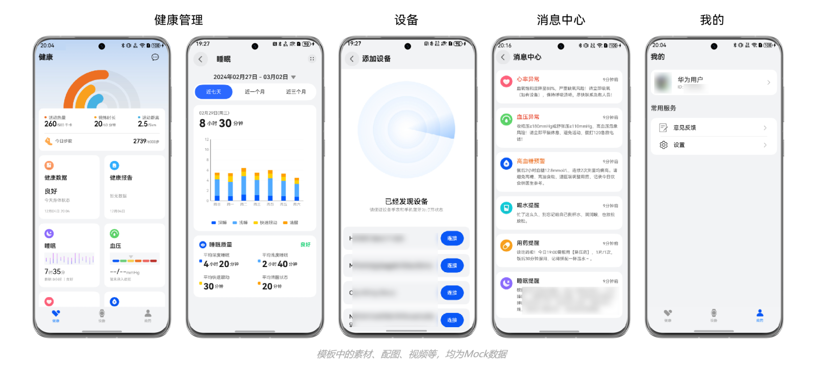 本模板为健康管理类应用提供了完整的开发框架,模板主要分健康、设备和个人三大模块。提供运动数据追踪、BMI 与体脂率计算、多项健康指标监测(血糖、心率、血压、睡眠)、健康知识、数据可视化分析等功能。模板已集成华为账号、微信登录、应用更新、消息推送等服务,采用模块化架构设计,支持多设备适配,提供完整的状态管理和路由导航解决方案,只需做少量配置和定制即可快速实现健康管理应用的核心功能。